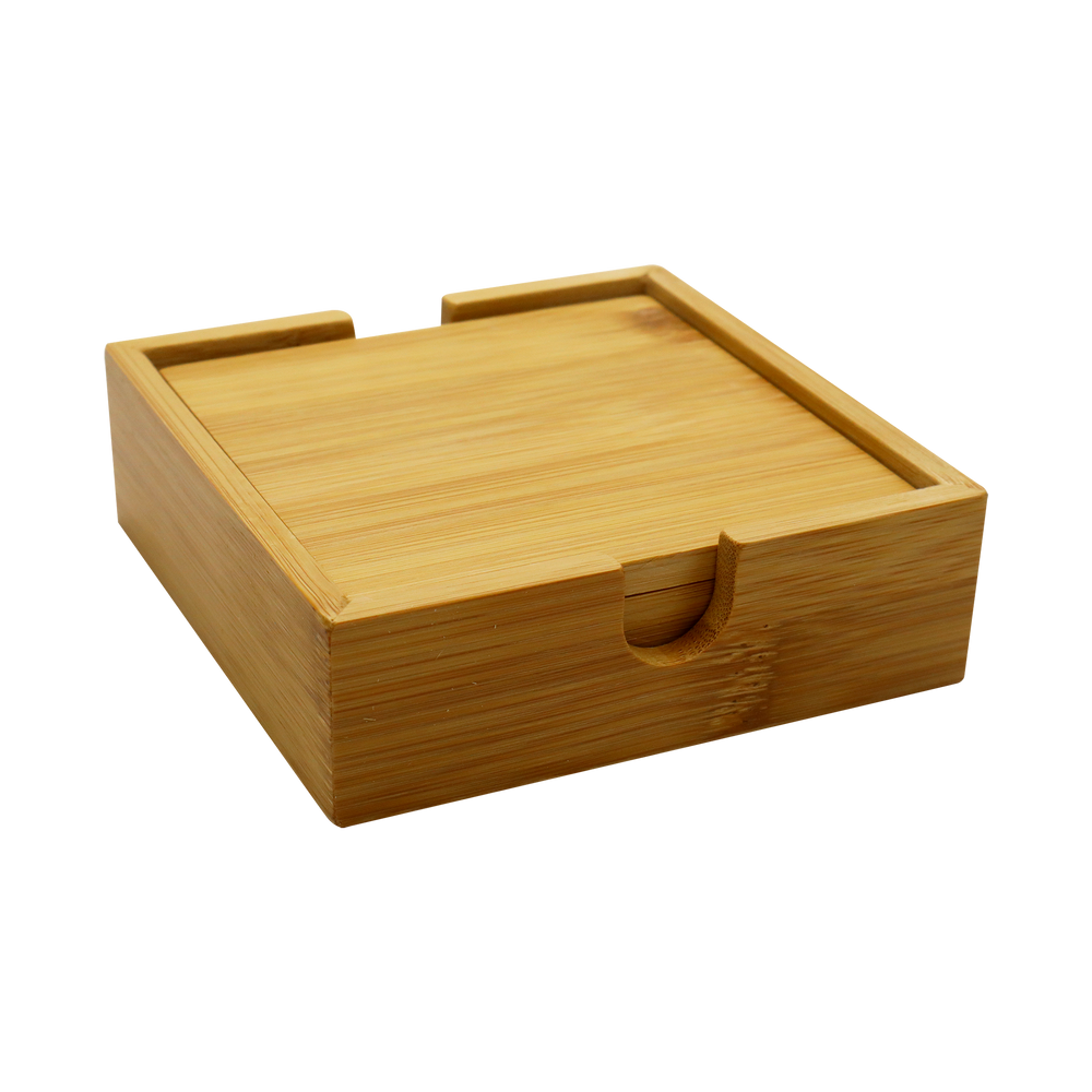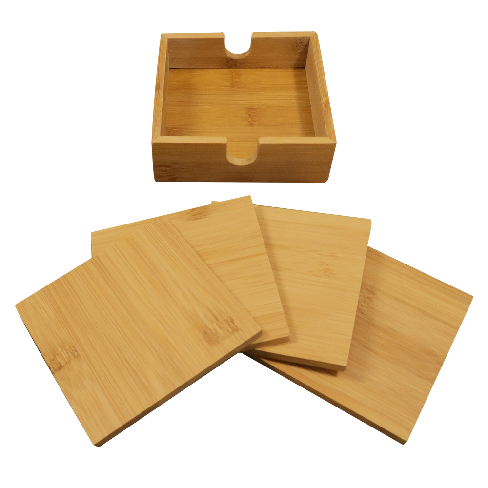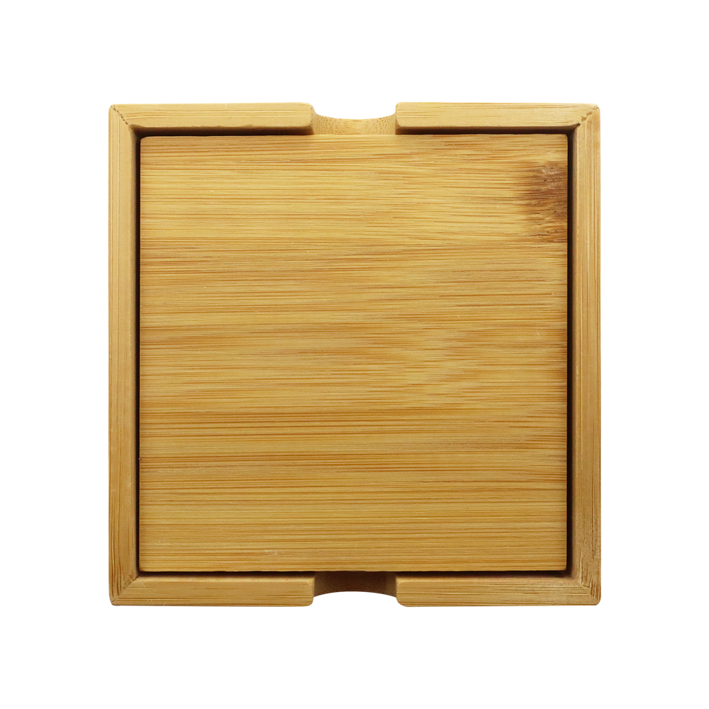 Convey your brand’s commitment to environmental sustainability with the Bamboo Coaster Set. Made from biodegradable bamboo, this set includes four coasters and a coaster holder all showcasing an attractive and natural wood grain finish. Great for your team's home or office space, these custom wooden coasters offer a custom imprint that may be engraved on the center of each coaster. This laser engraving is tone-on-tone with no oxidation, creating a sophisticated final look. Please note that bamboo products are prone to color variances and may differ in shade between multiple sets. Introduce a layer of comfort and style to your space when you add the Bamboo Coaster Set featuring your brand’s custom artwork.