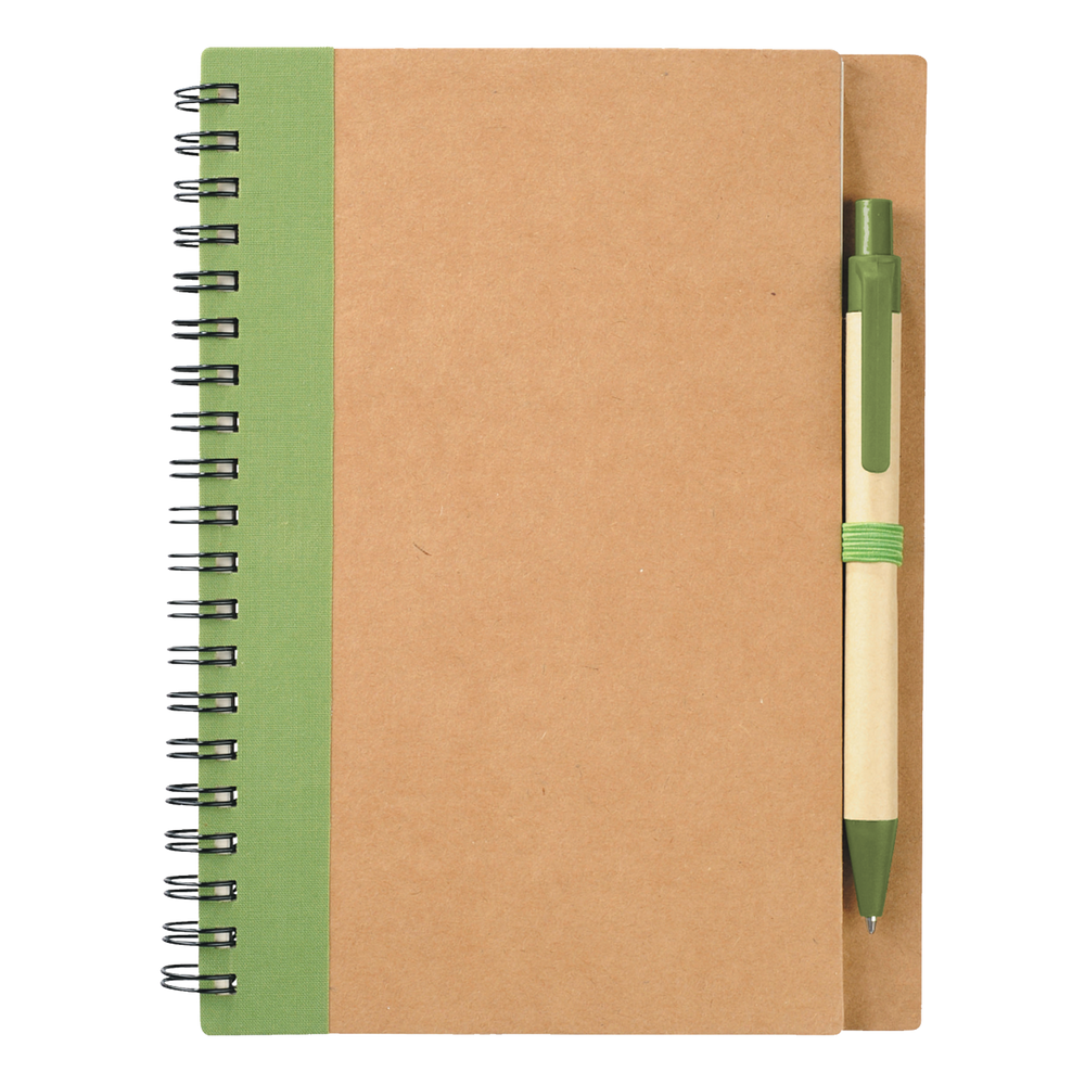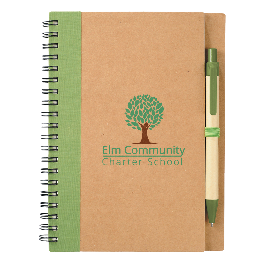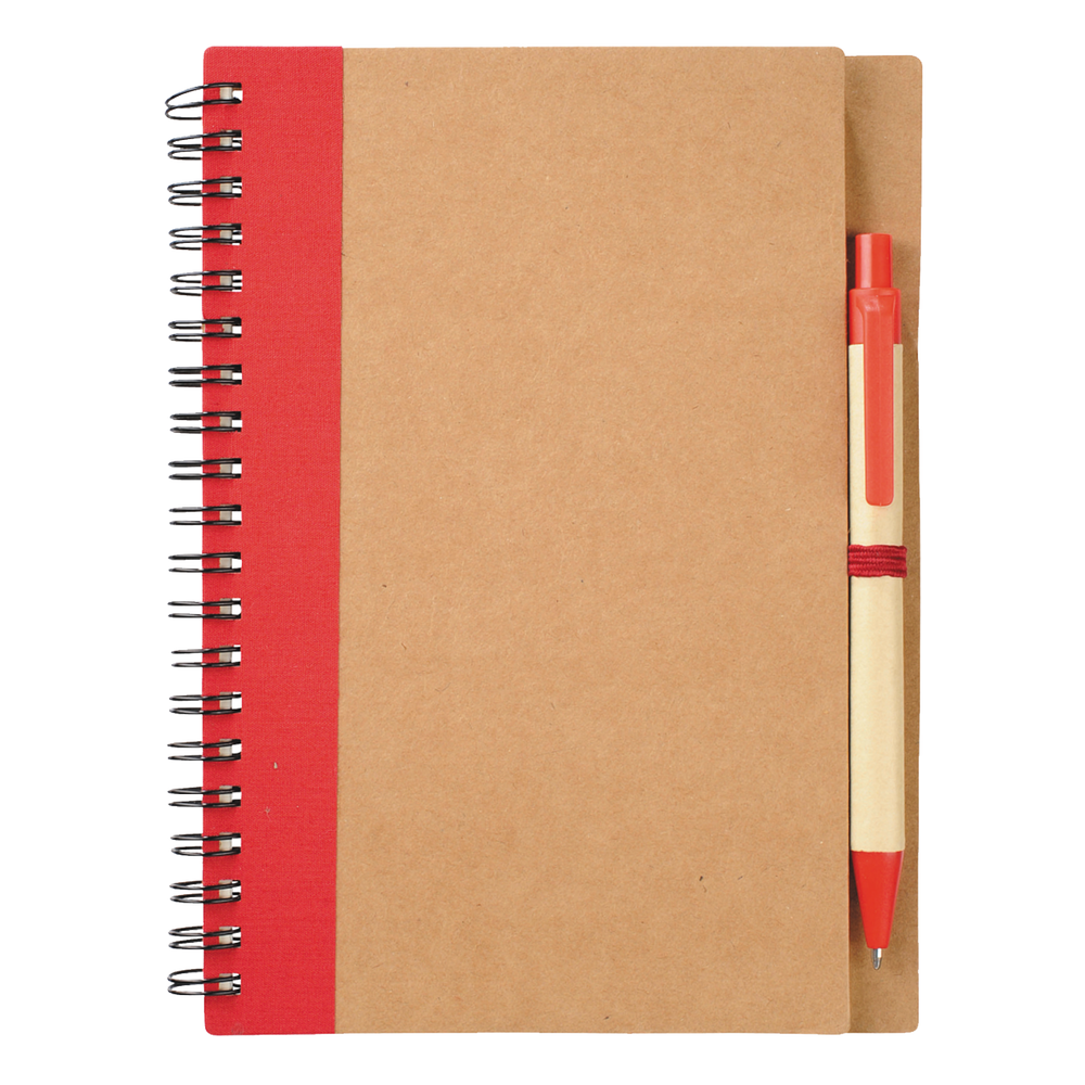 Our Eco-Friendly Spiral Notebook with Pen features 60 ruled sheets of paper, has a matching color elastic pen loop, and comes with a matching color ballpoint pen. Each custom notebook is made from 100% recycled materials. Please note that pens are packed separately from notebooks.