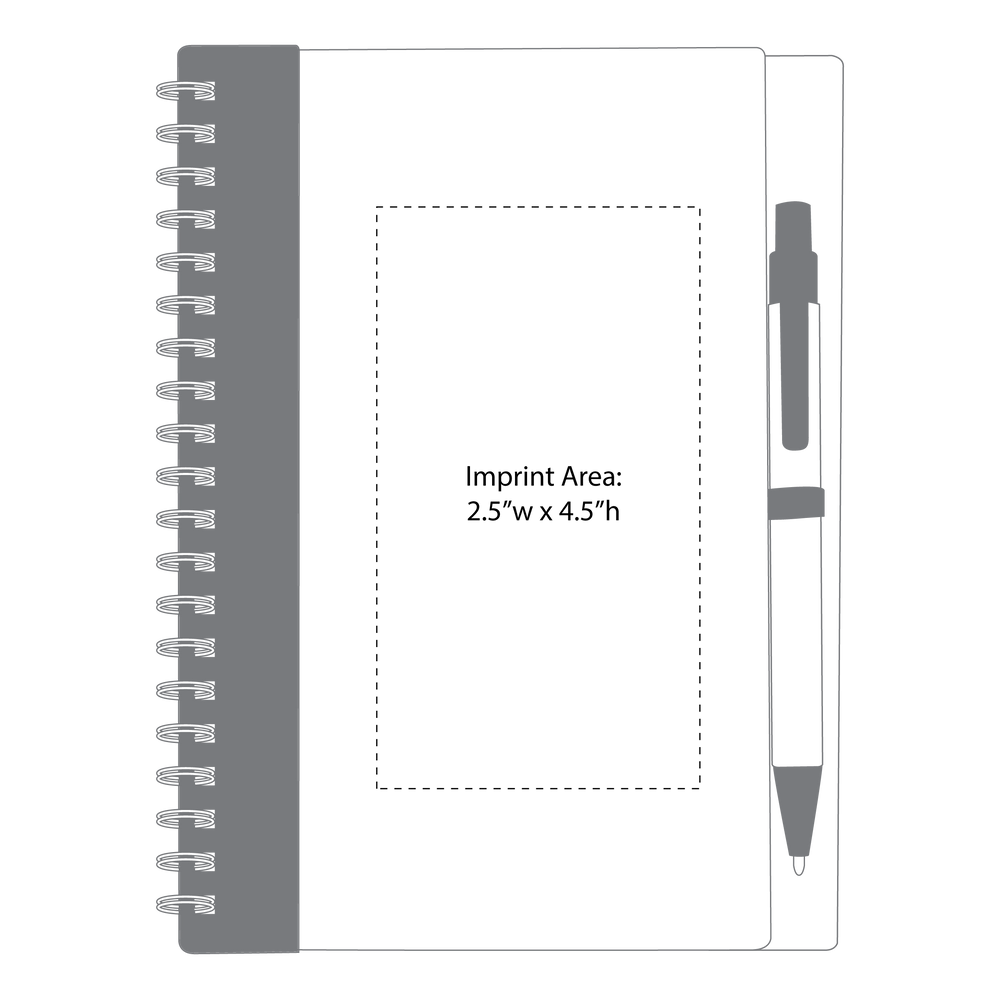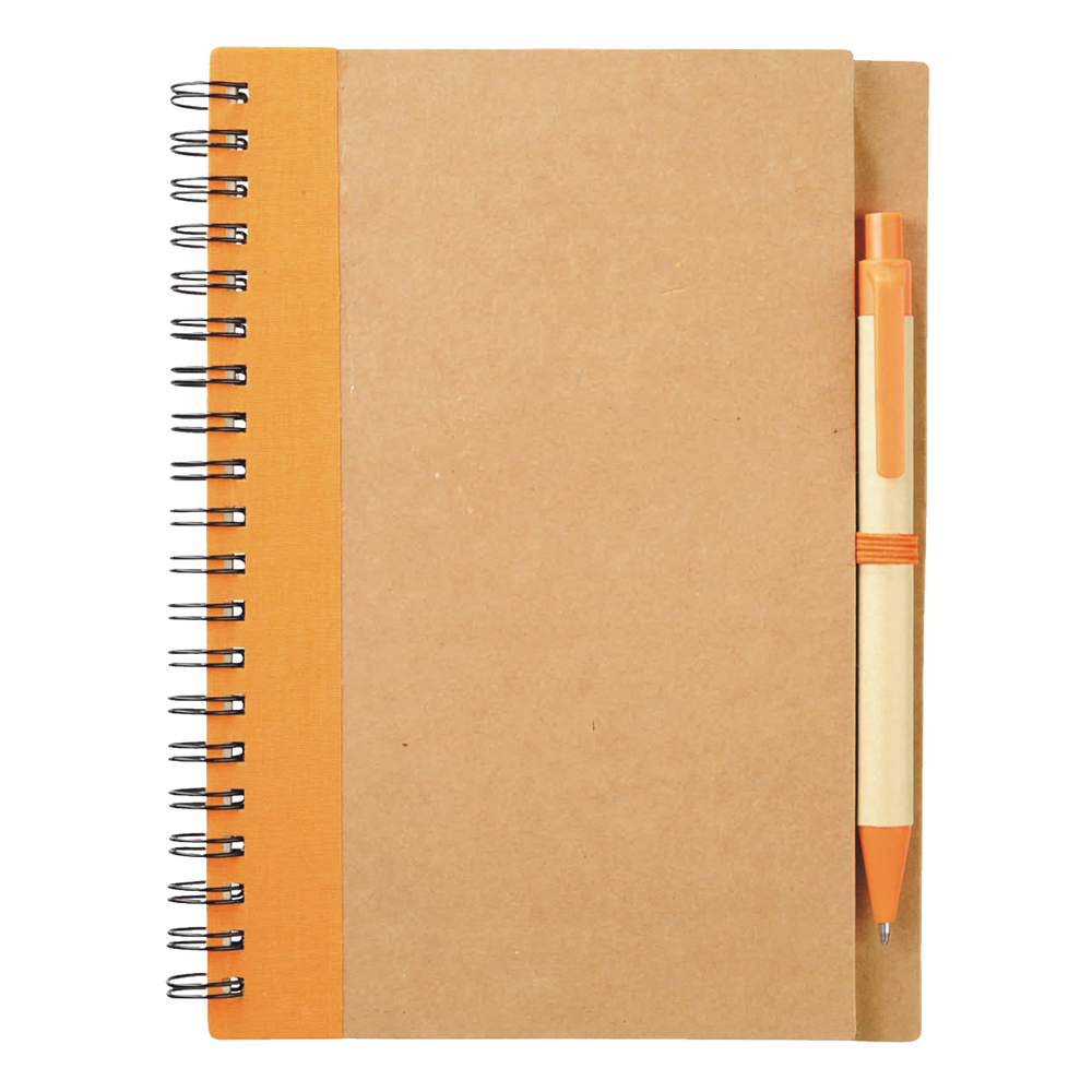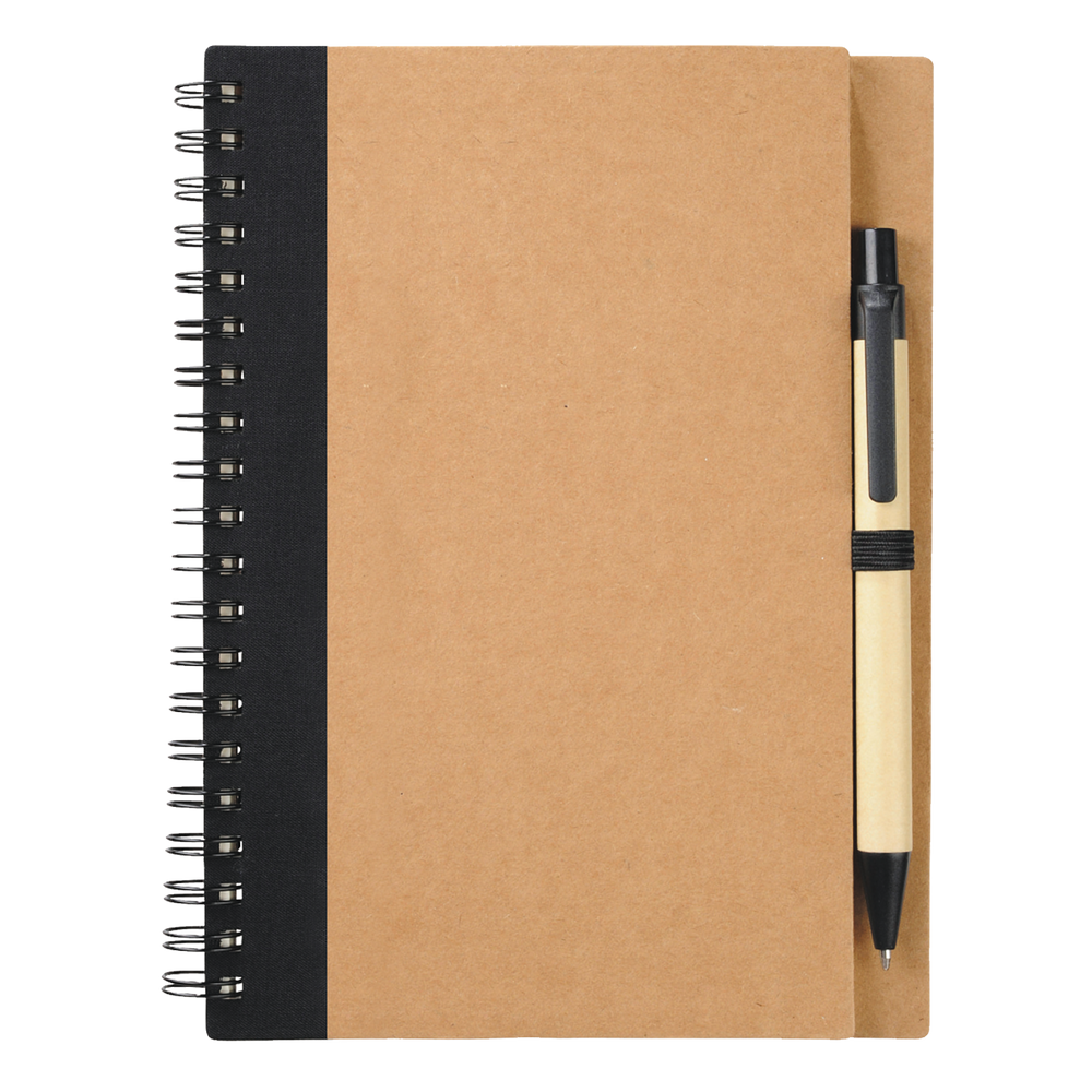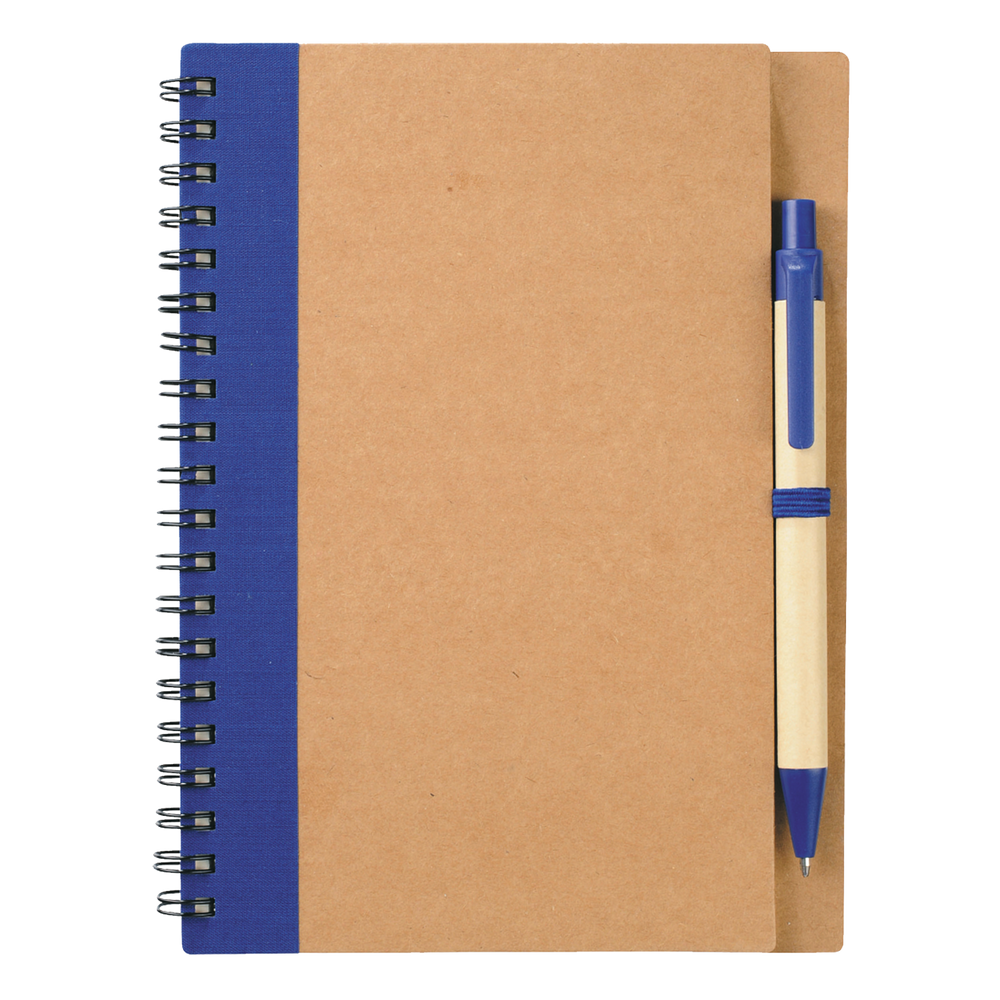 Our Eco-Friendly Spiral Notebook with Pen features 60 ruled sheets of paper, has a matching color elastic pen loop, and comes with a matching color ballpoint pen. Each custom notebook is made from 100% recycled materials. Please note that pens are packed separately from notebooks.