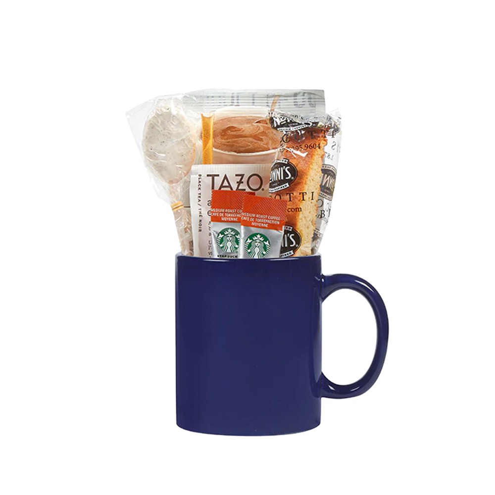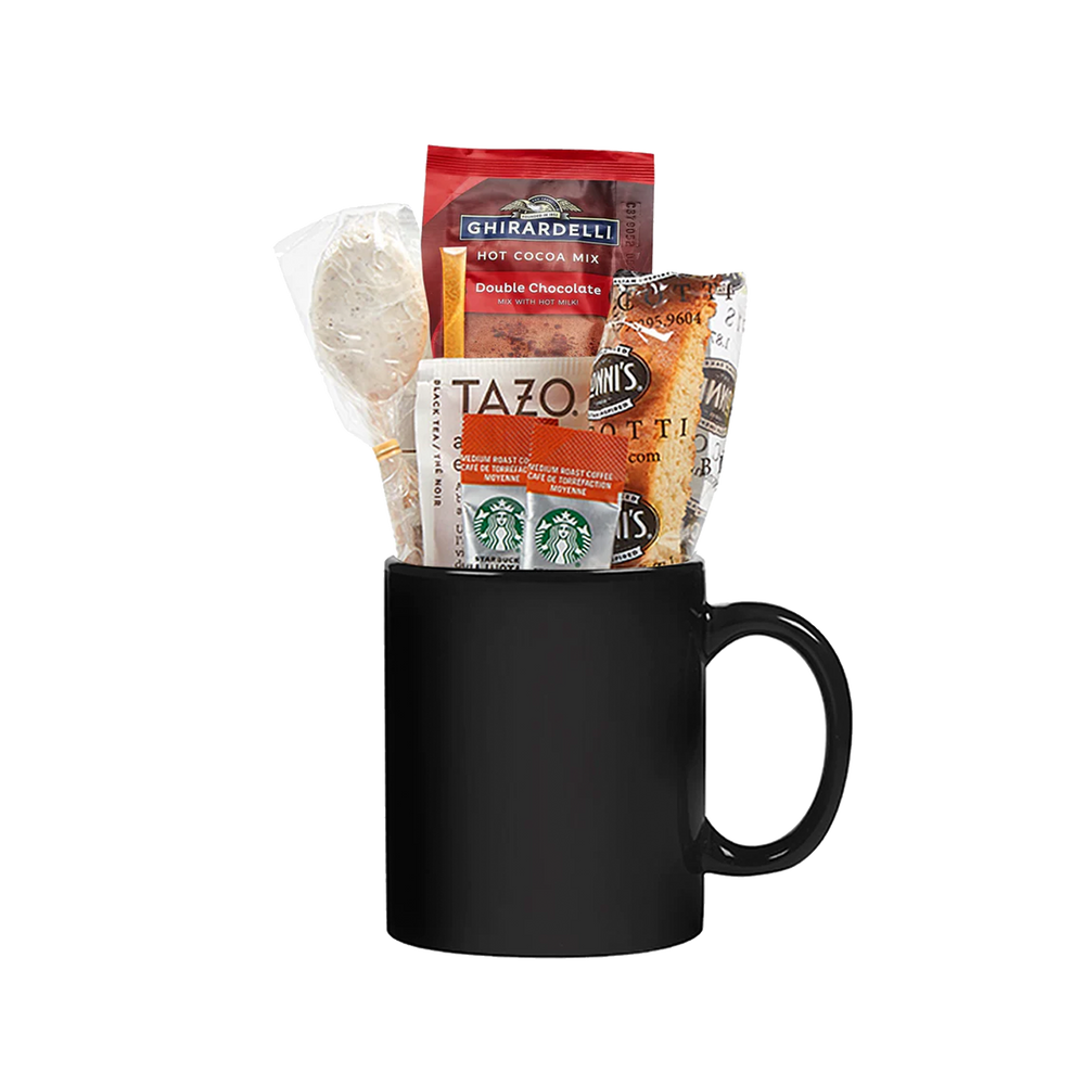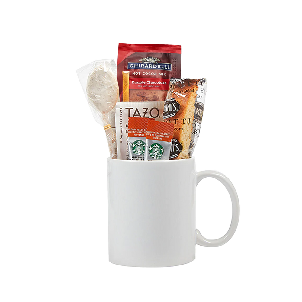 The Fireplace Feelings Gift Set includes an 11oz Ceramic coffee mug stuffed with a Hot Cocoa Packet, French Vanilla Coffee Spoon, Honey Stick, Nonni's Biscotti, Tazo Tea Bag, and two Starbucks Via Instant Coffee Singles. All packaged up in a gusseted gift bag with chipboard reinforced bottom and a pre-tied satin bow.