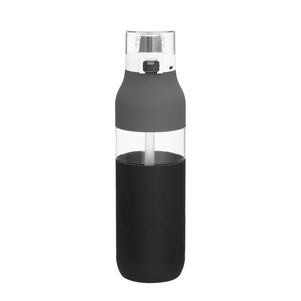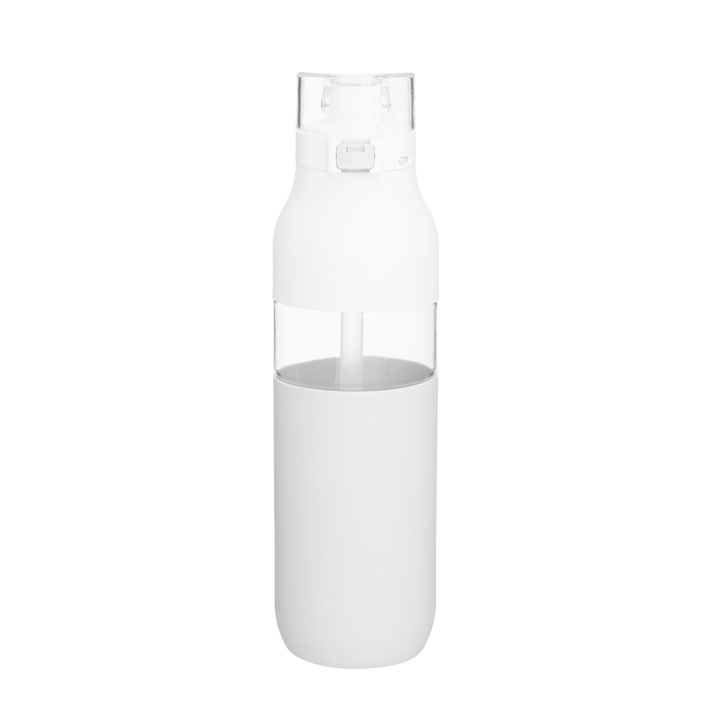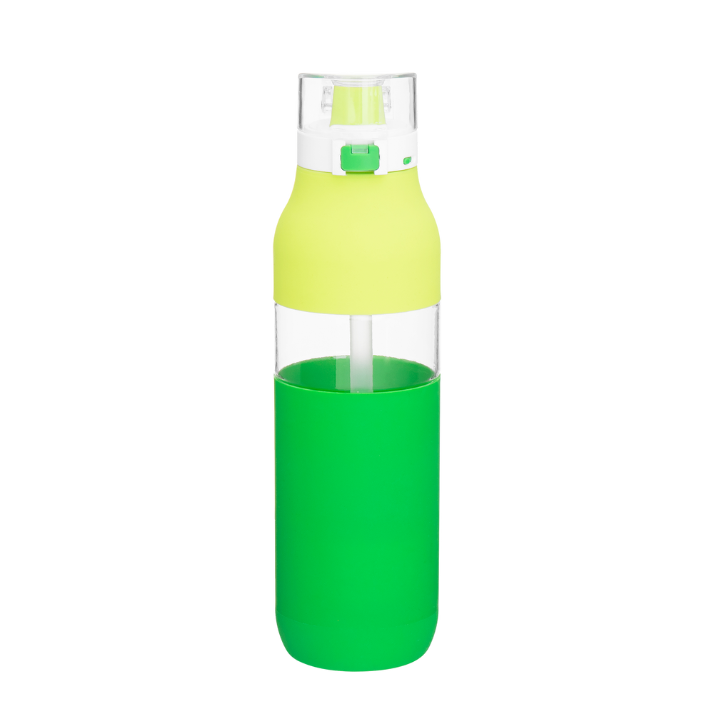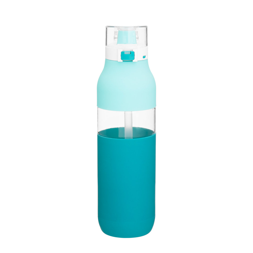 The Snazzy Water Bottle includes a threaded one-touch push-button lid, locking mechanism, silicone drinking spout, inner soft straw, dual-tone silicone accent, and carrying handle