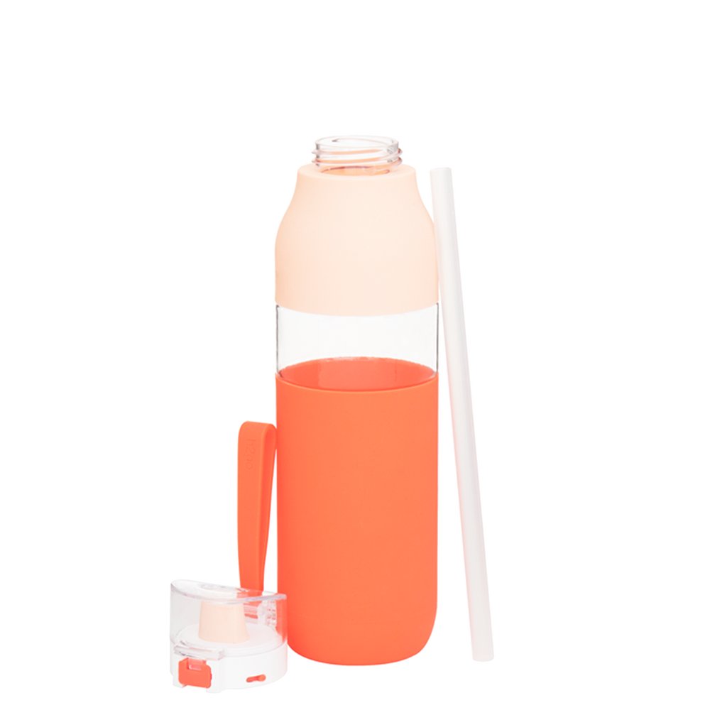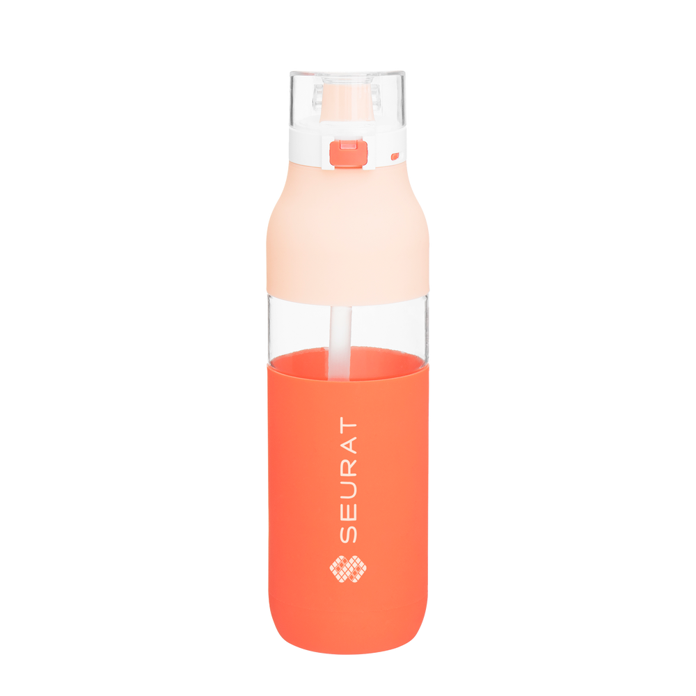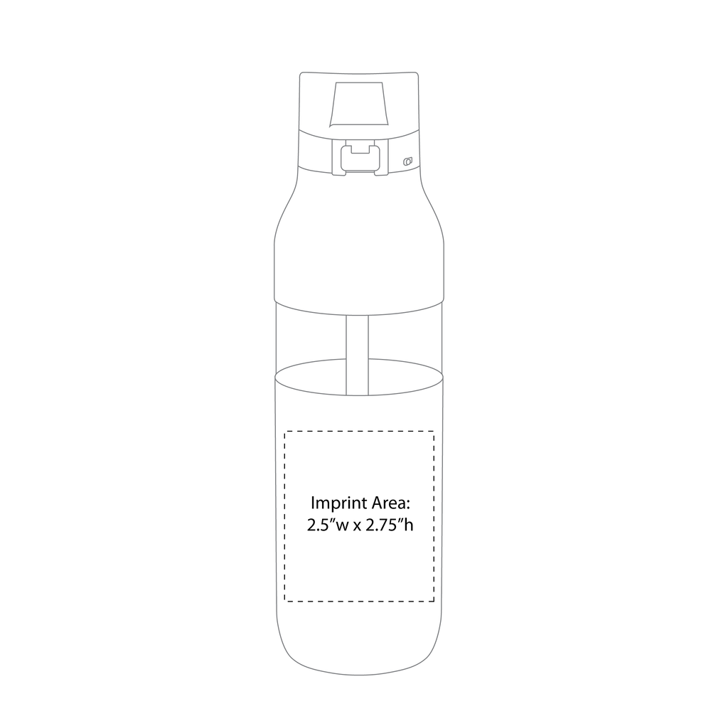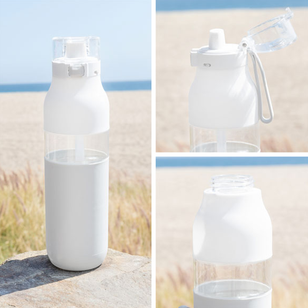 The Snazzy Water Bottle includes a threaded one-touch push-button lid, locking mechanism, silicone drinking spout, inner soft straw, dual-tone silicone accent, and carrying handle