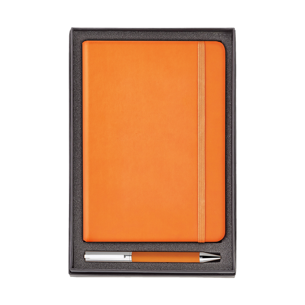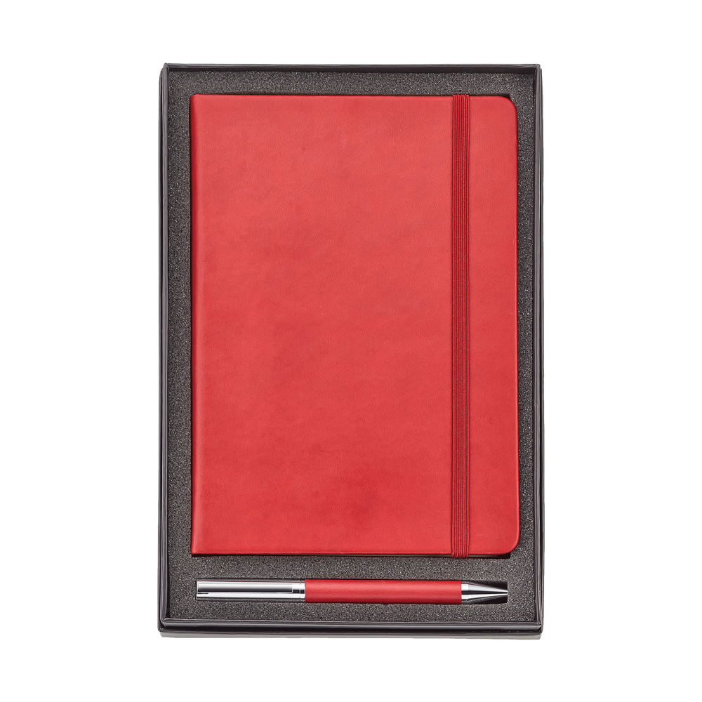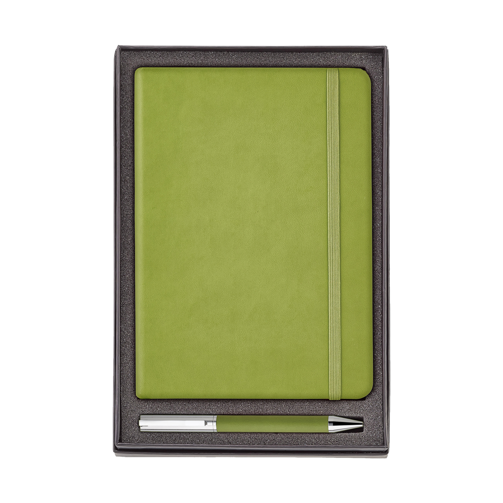 The Hard Cover Journal and Ballpoint Pen Gift Set includes a Hard Cover Journal with 192 perforated ivory lined pages, gusseted pocket, and elastic enclosure band, as well as a heavyweight, twist action brass ballpoint pen.