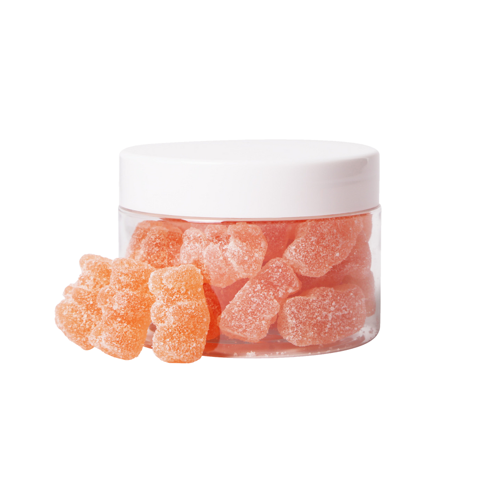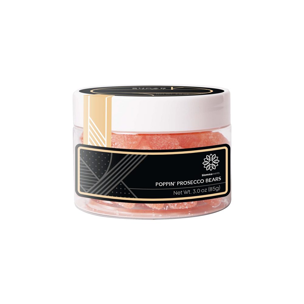 Pop, fizz, clink - it's time for a toast! Enjoy a jar (3oz) of Prosecco Tart Gummy Bears - Sweet prosecco-flavored gummy bears finished with tart sugar crystals. Non-alcoholic.