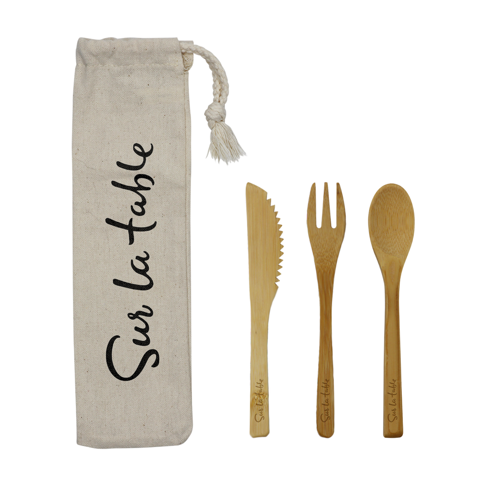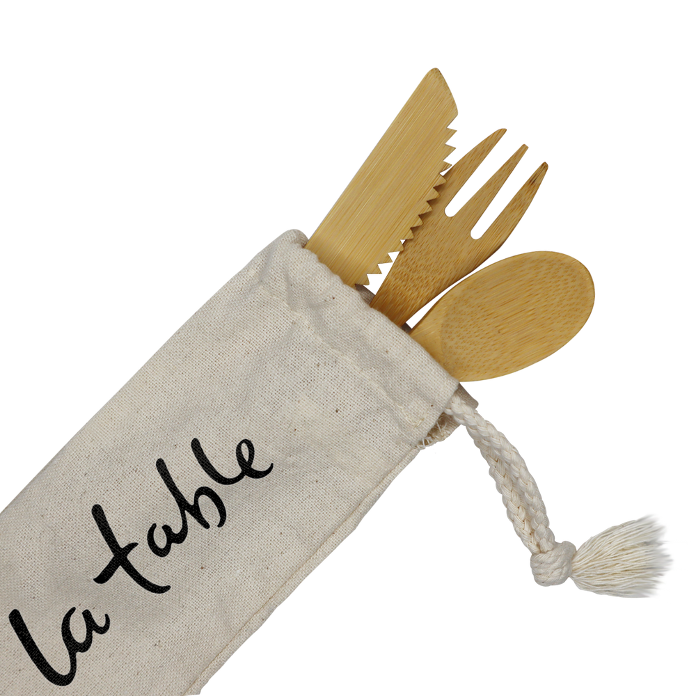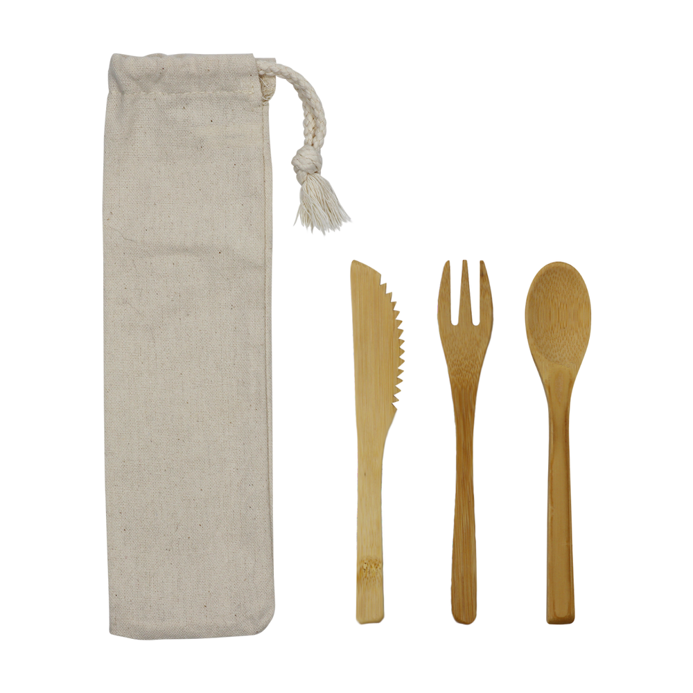 - Set includes fork, spoon, knife, and cotton carrying pouch