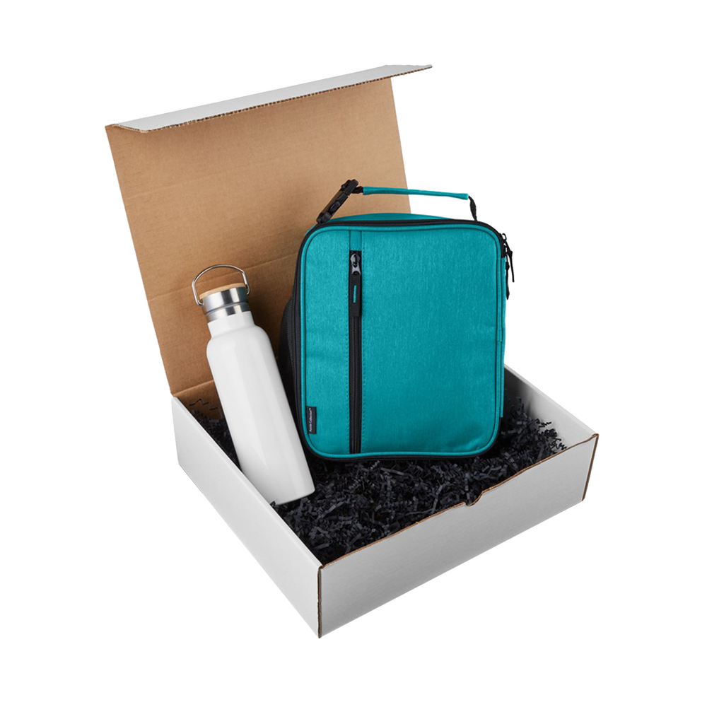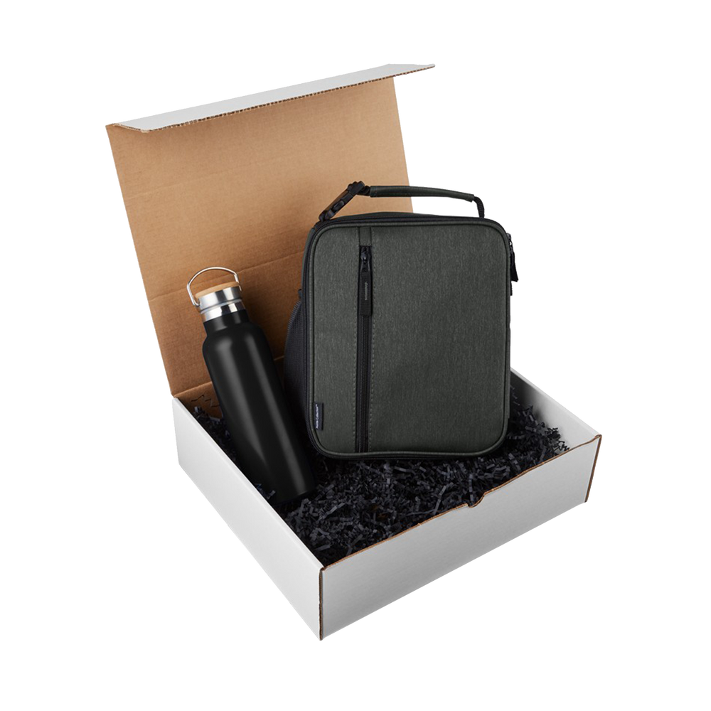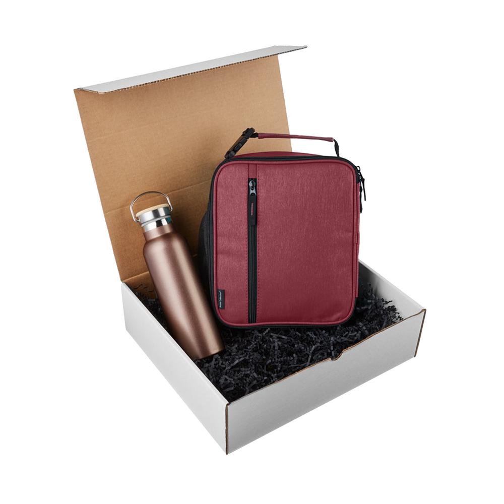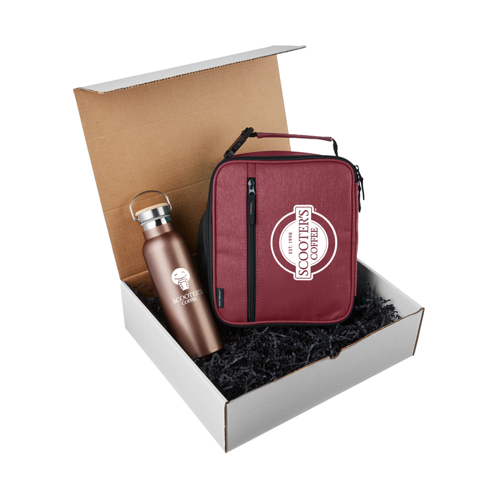 The Sip & Snack Gift Set includes a 20 oz vacuum insulated tumbler and a heathered cooler bag. The custom tumbler helps keep your beverages hot or cold longer than traditional insulation. The custom cooler bag features large zipper main compartment with interior mesh pocket, front zipper pocket, and a carry handle.