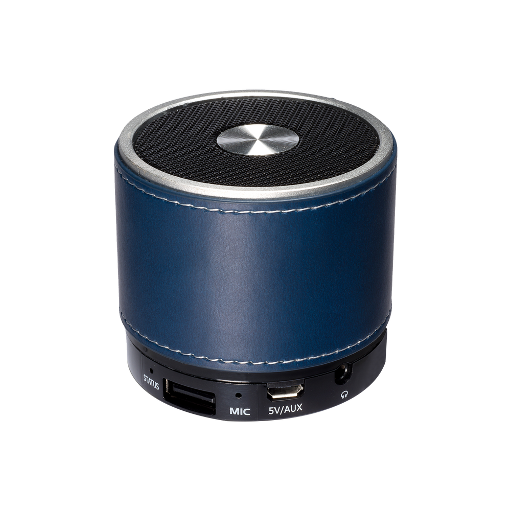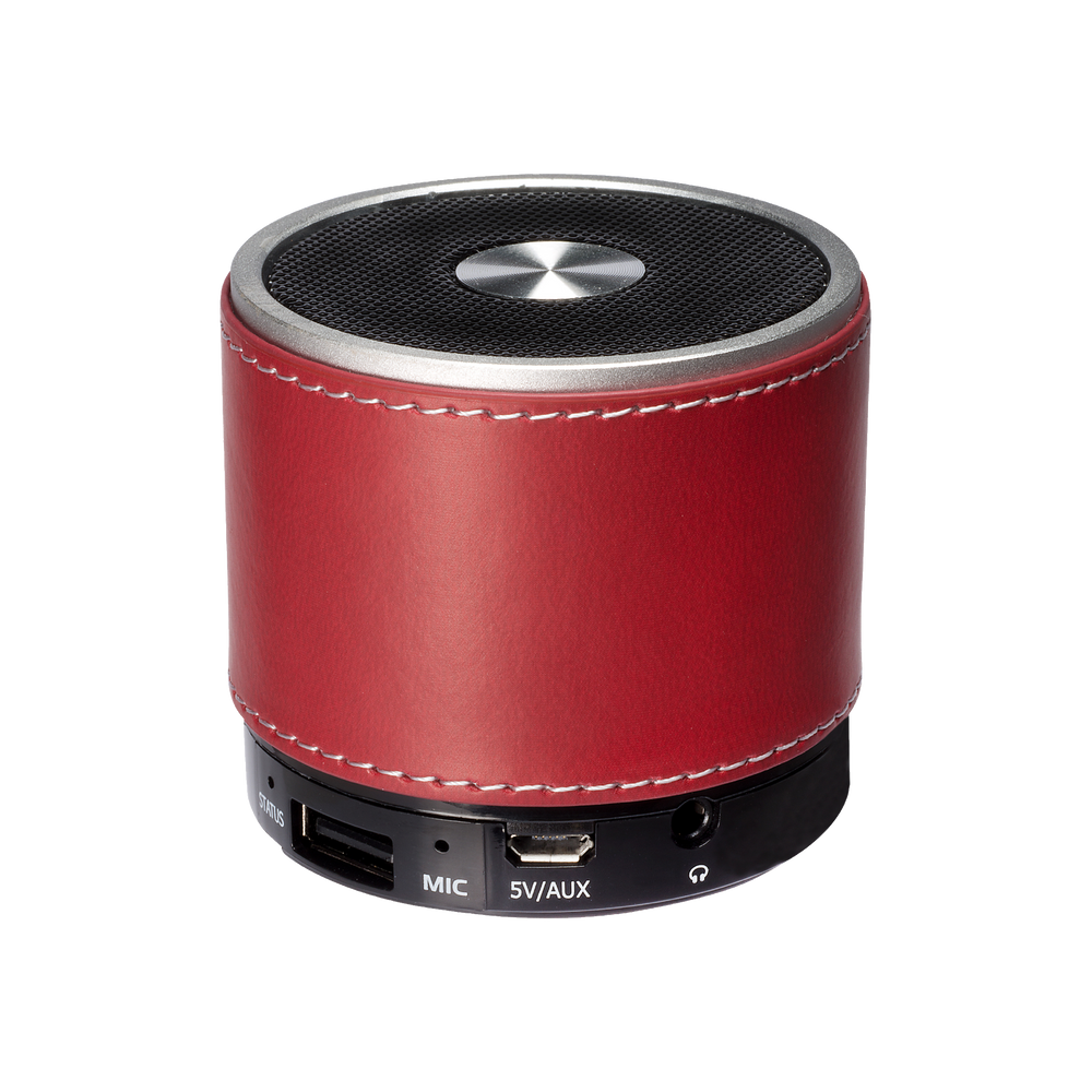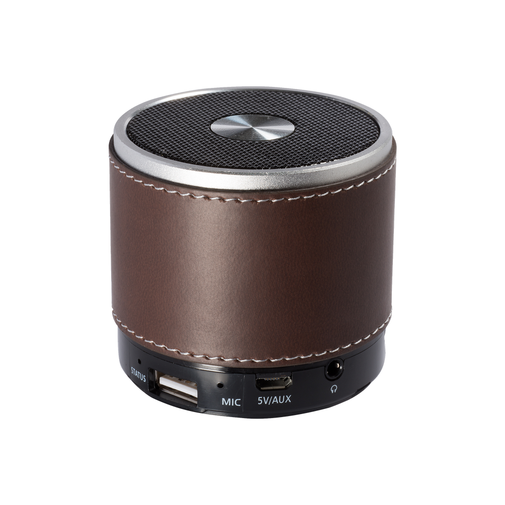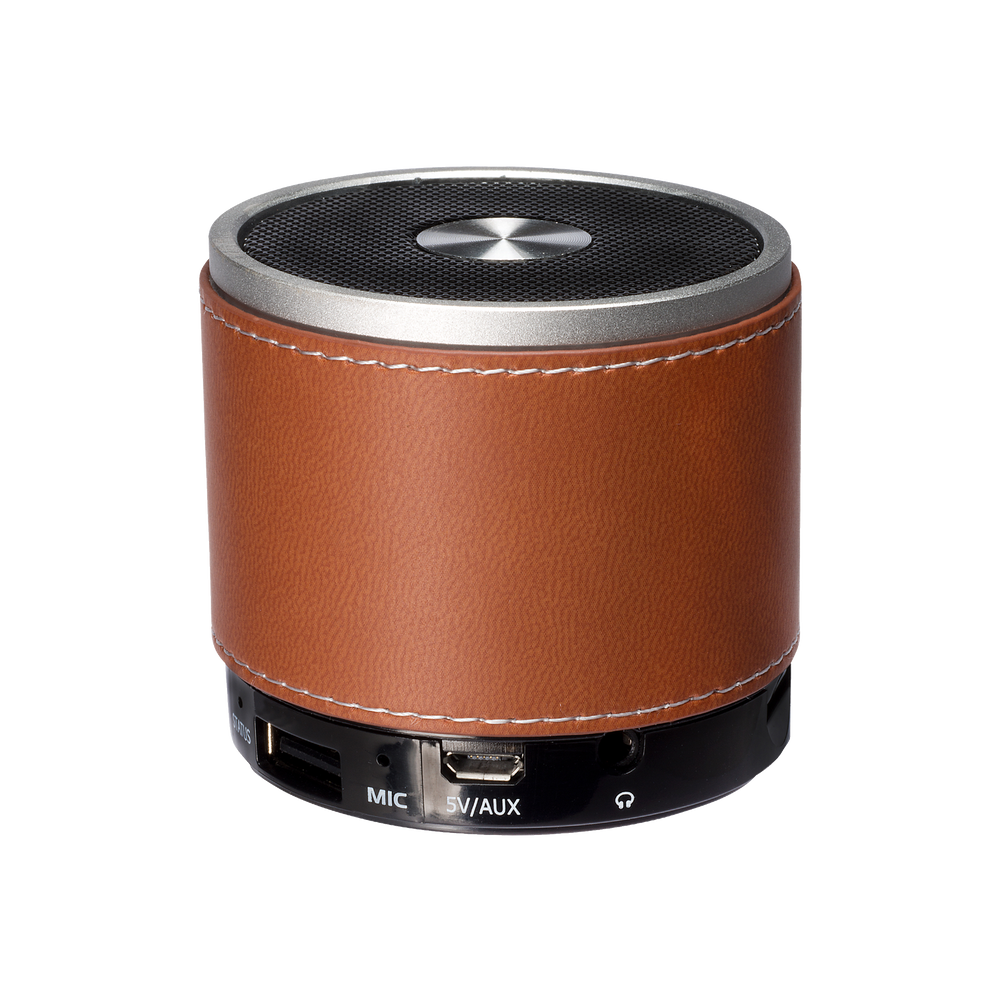 The Tuscany™ Faux Leather Wireless Speaker features is a palm-sized cylinder wireless speaker with soft-PU accent wrap body and no-slip bottom that you can pair with your smartphone to use hands-free microphone feature, and can also play MP3 files though a USB flash drive or TF card.