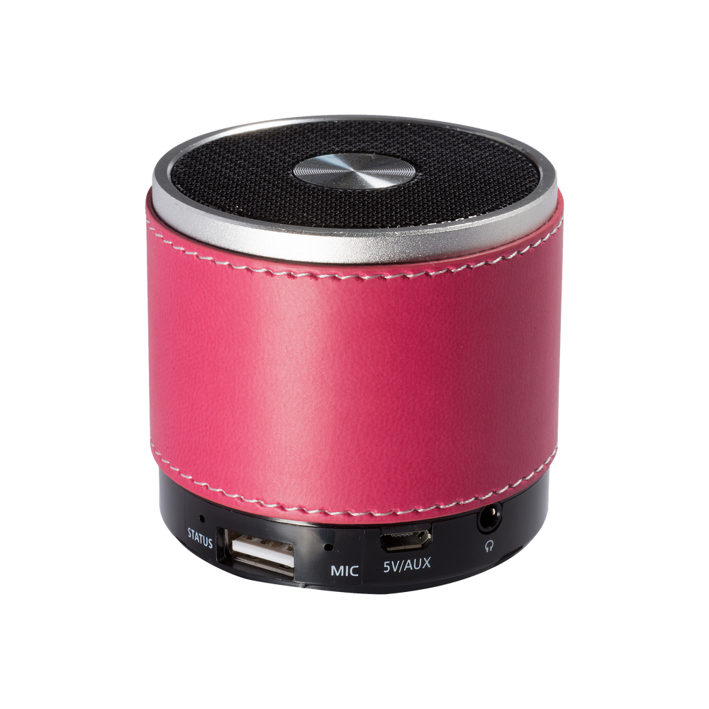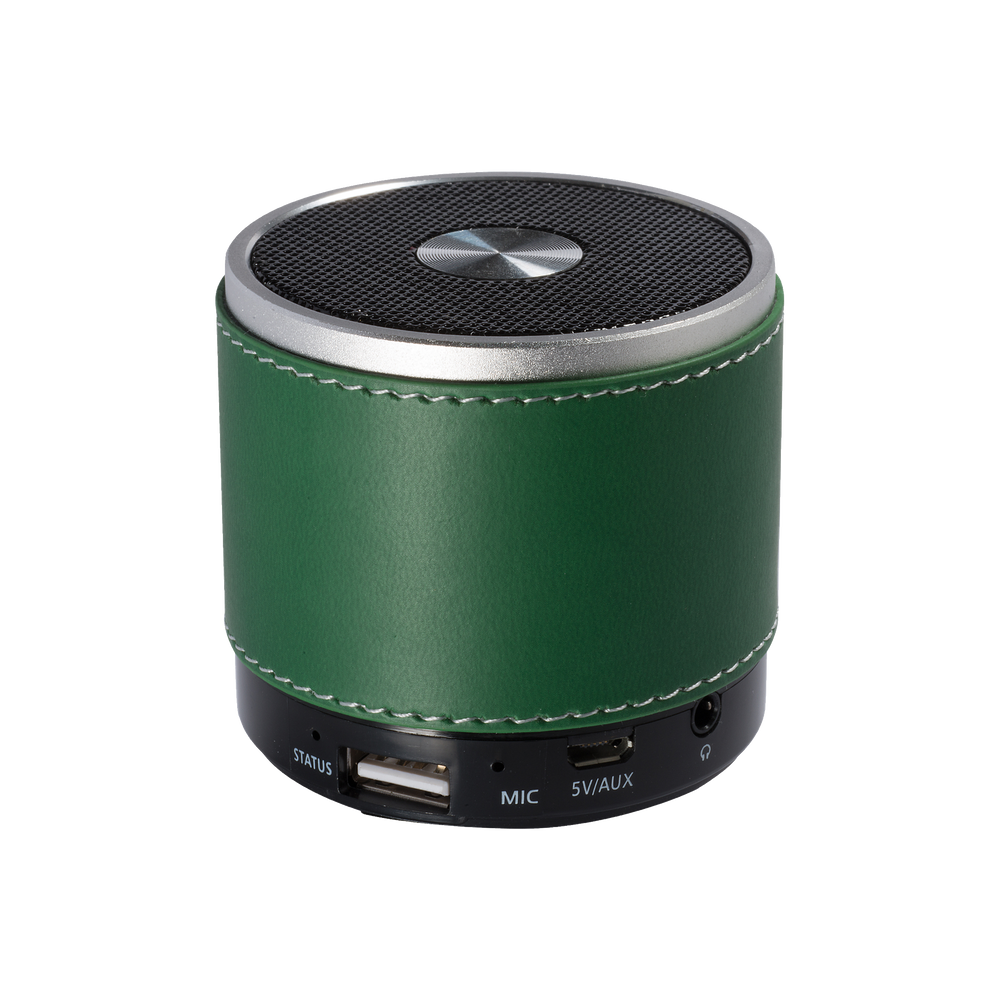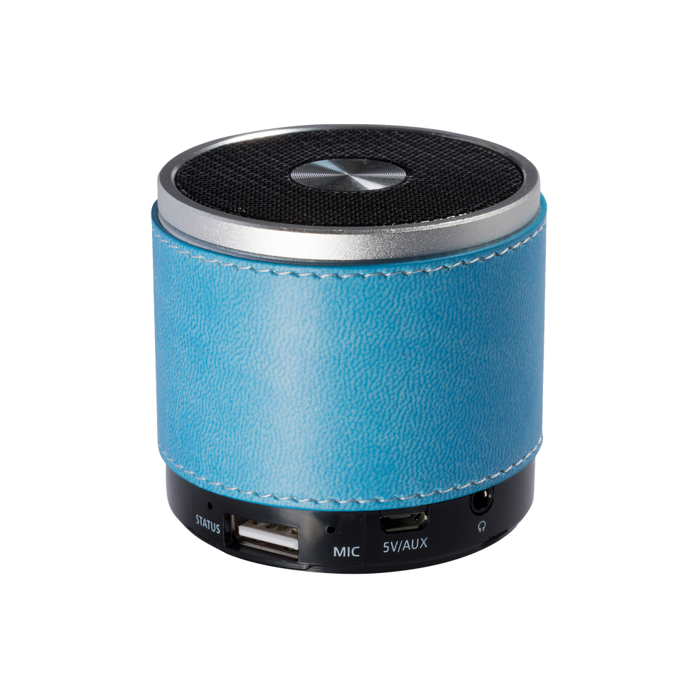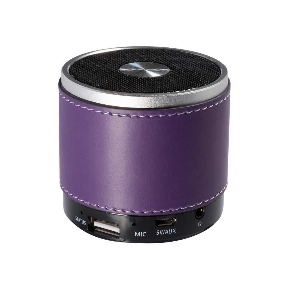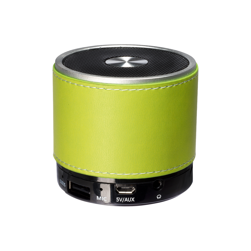 The Tuscany™ Faux Leather Wireless Speaker features is a palm-sized cylinder wireless speaker with soft-PU accent wrap body and no-slip bottom that you can pair with your smartphone to use hands-free microphone feature, and can also play MP3 files though a USB flash drive or TF card.
