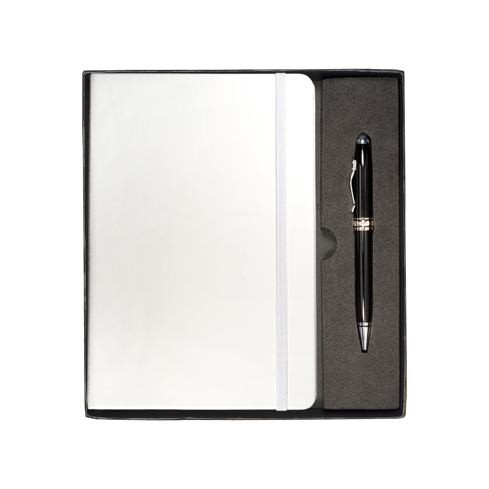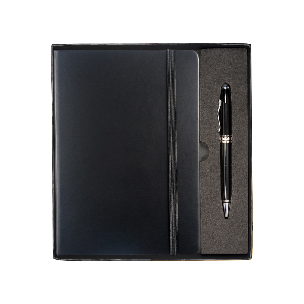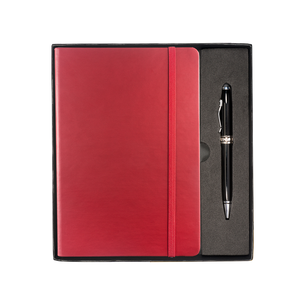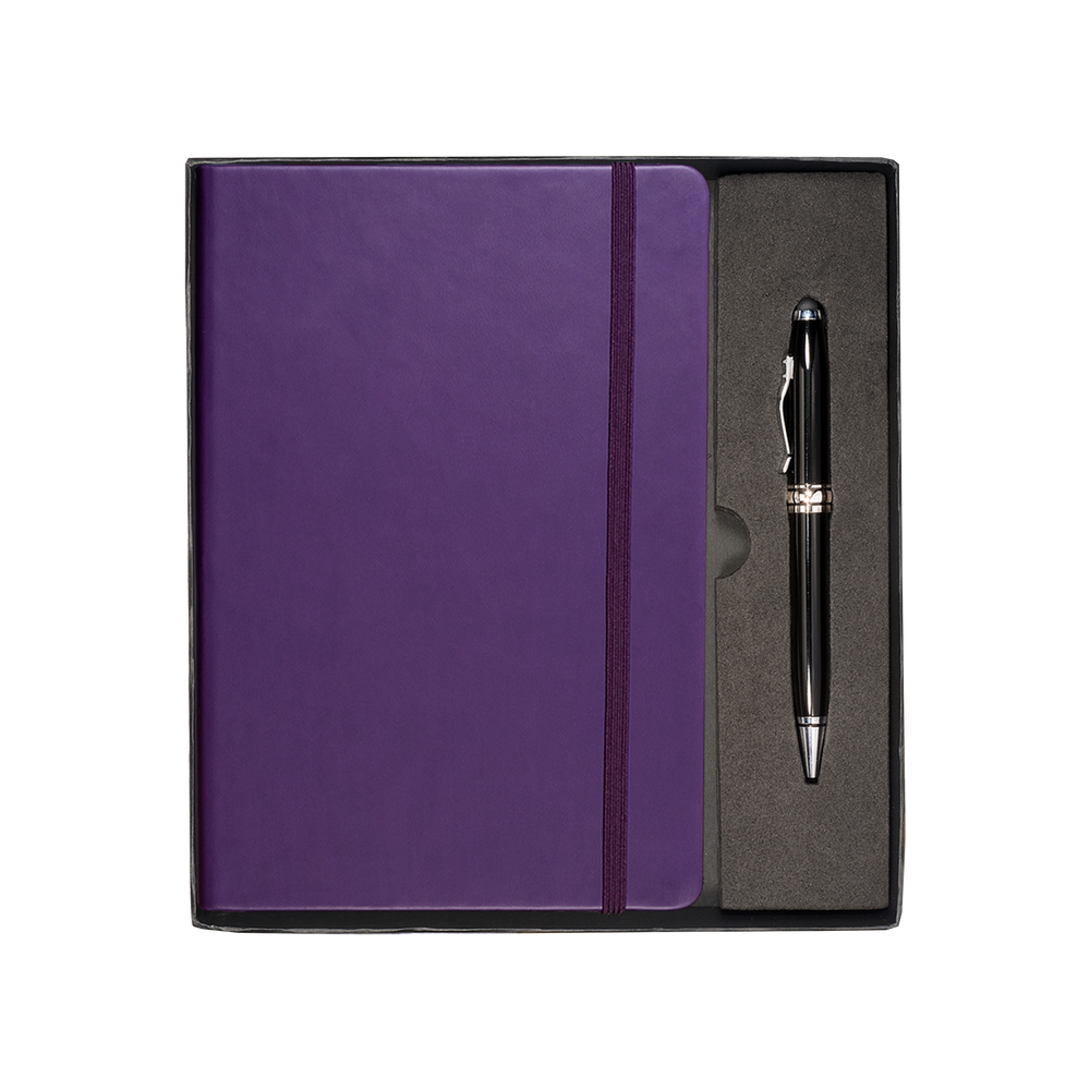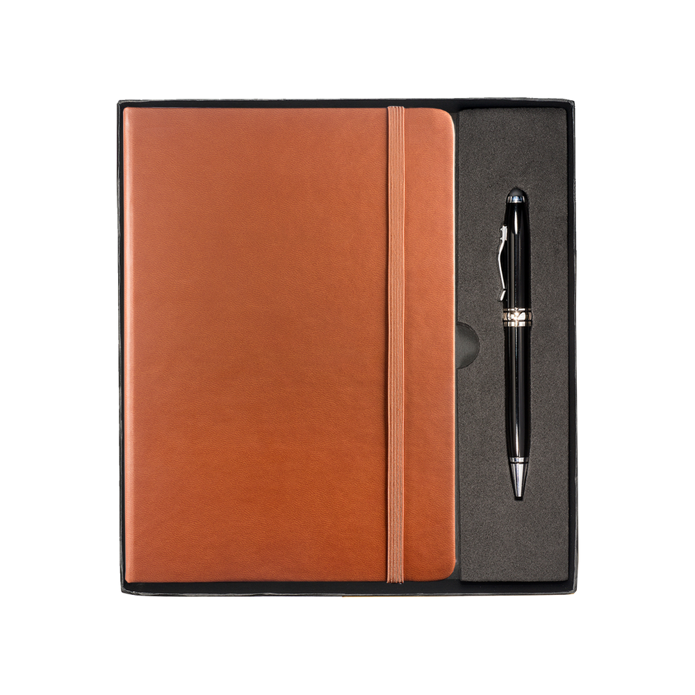 The Tuscany™ Journal and Stylus Pen Gift Set includes the Tuscany™ Journal, featuring a soft faux leather cover, 80 ruled pages, elastic loop closure and bookmark with document pocket on inside back cover, as well as the Executive Stylus/Pen with an aluminum twist-action ballpoint pen and soft silicone stylus tip.