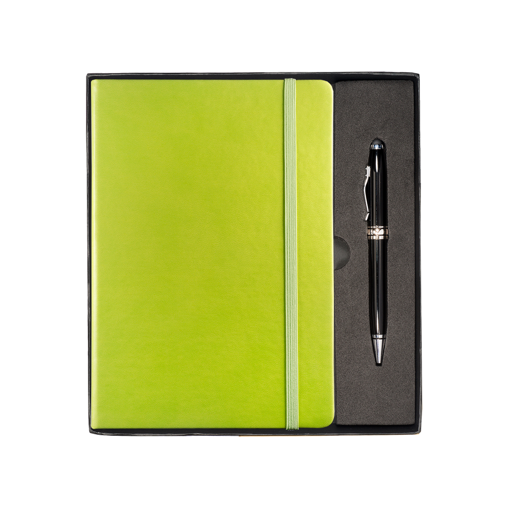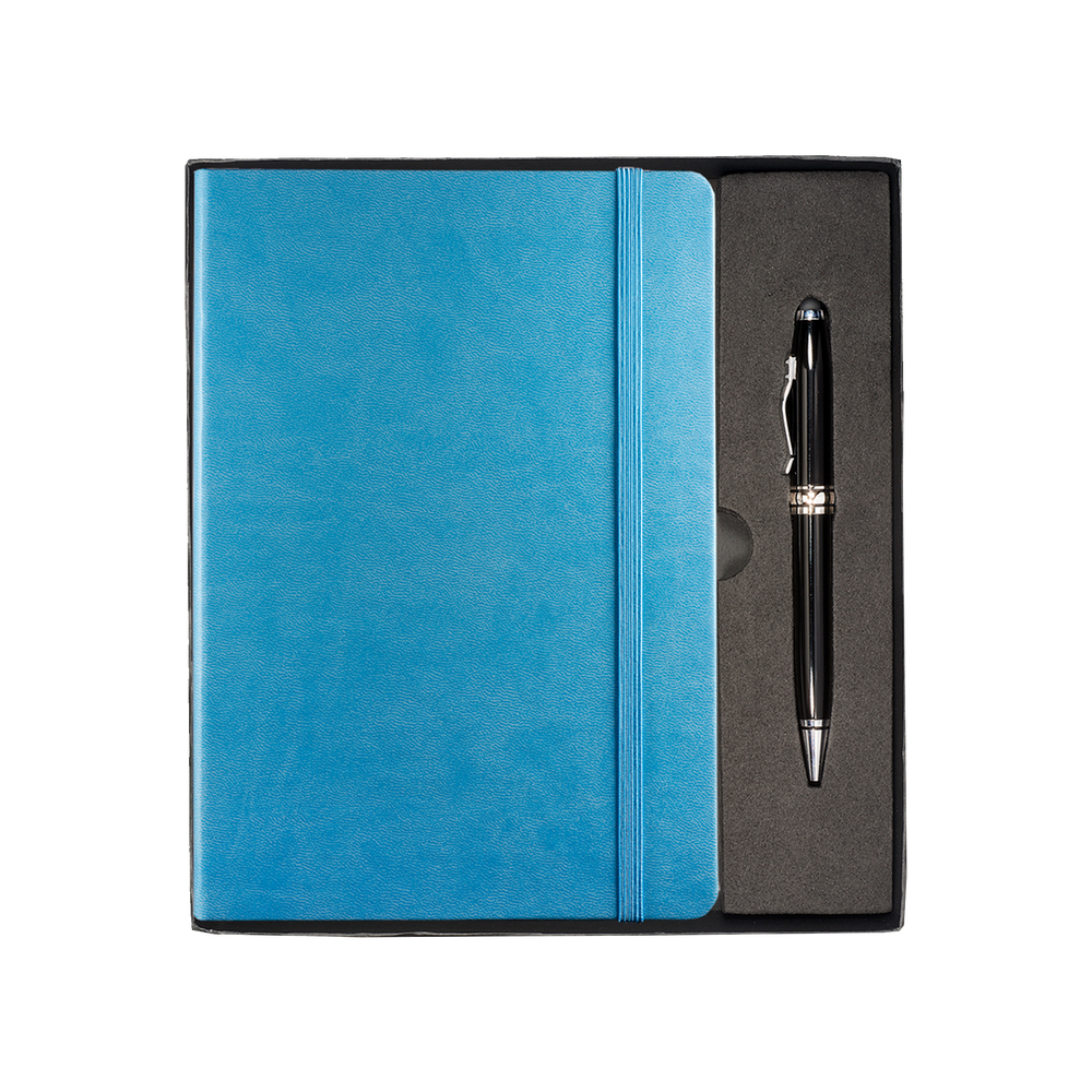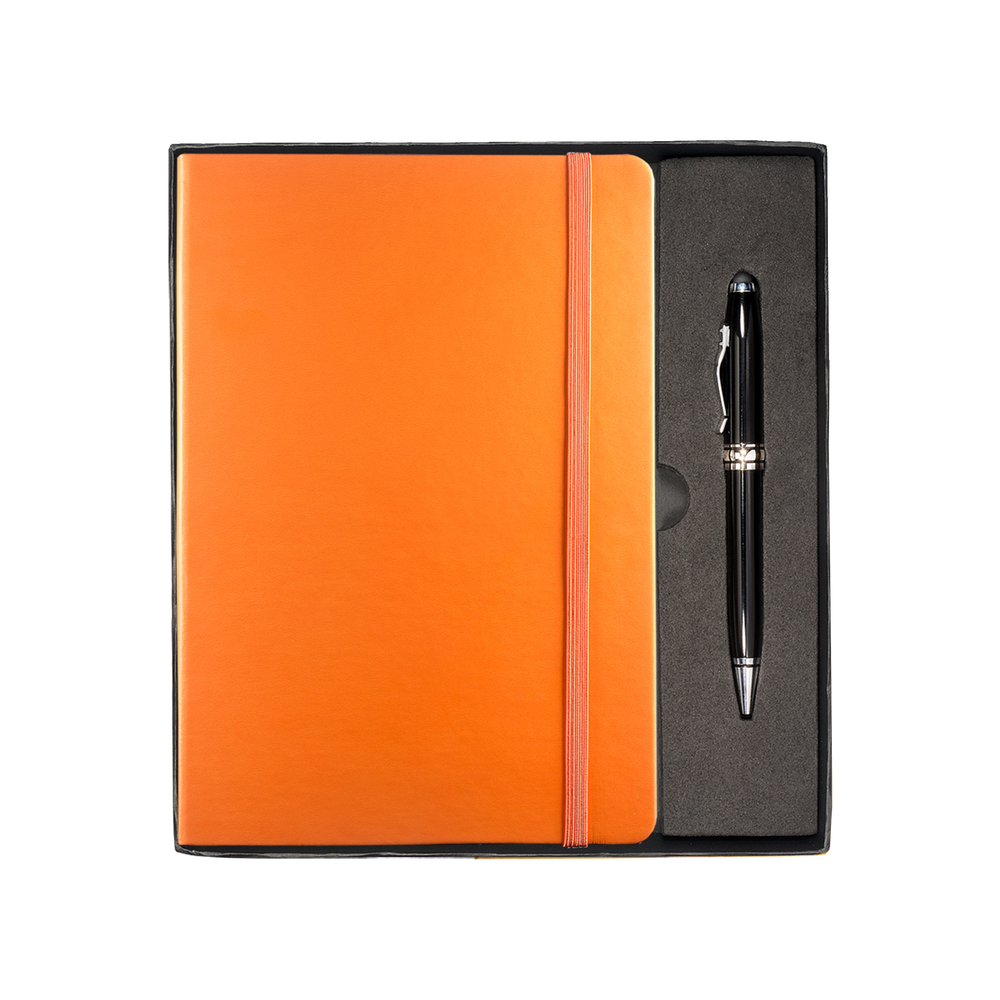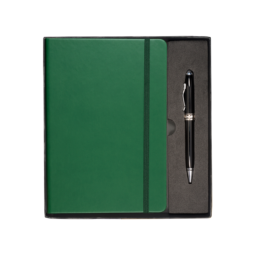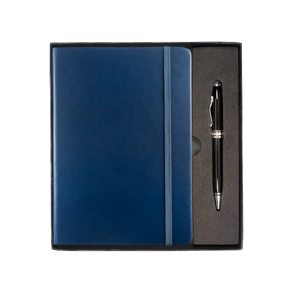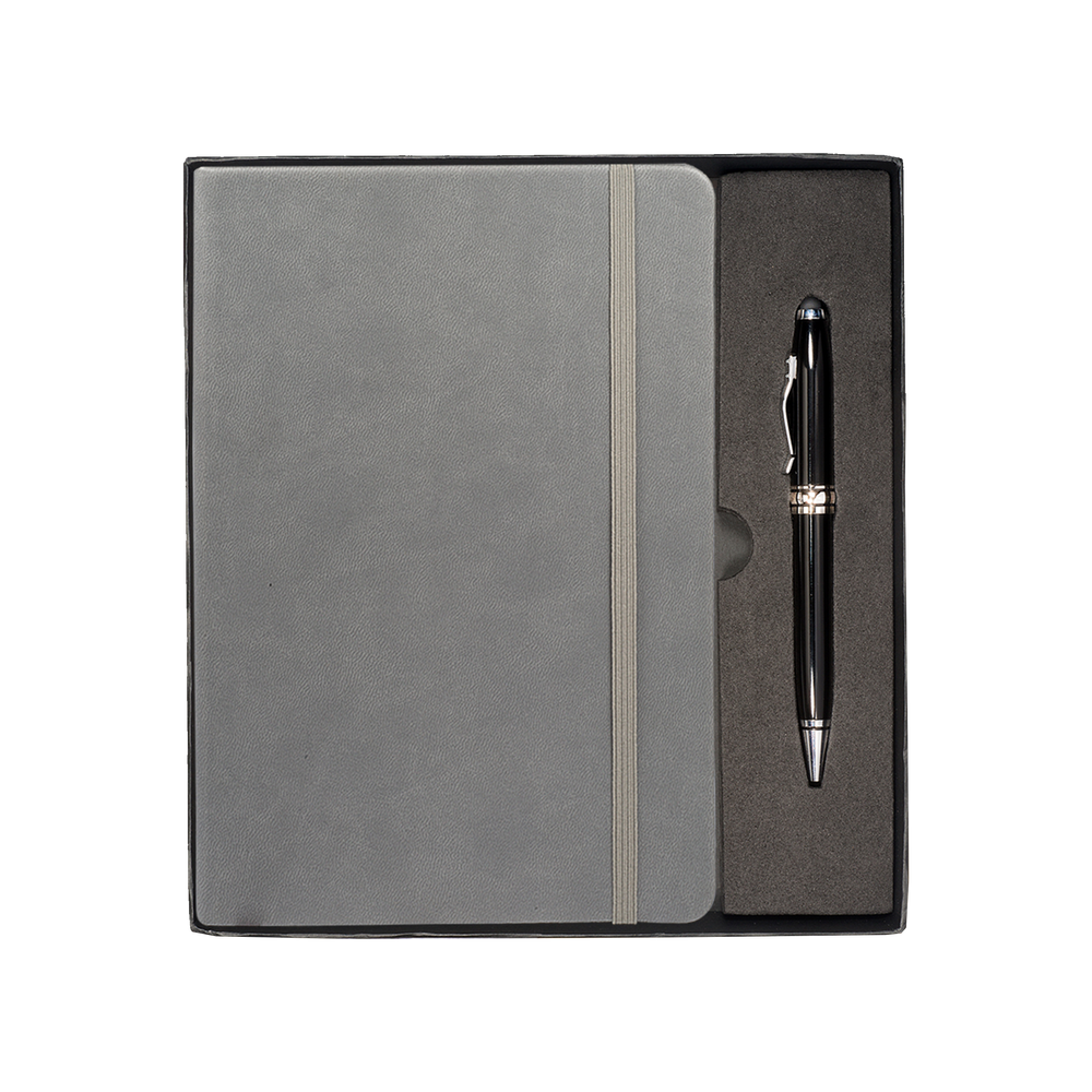 The Tuscany™ Journal and Stylus Pen Gift Set includes the Tuscany™ Journal, featuring a soft faux leather cover, 80 ruled pages, elastic loop closure and bookmark with document pocket on inside back cover, as well as the Executive Stylus/Pen with an aluminum twist-action ballpoint pen and soft silicone stylus tip.